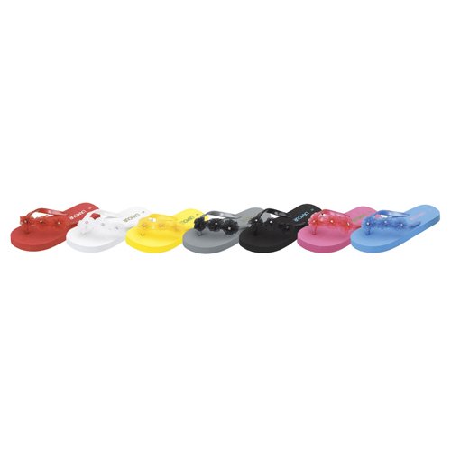 A little girl can't have too many cute shoes. These flip flops have flowers lining one strap with a rhinestone center. Cute for any occasion and makes a great addition to her summer wardrobe. Comes in your choice of red, white, yellow, grey, black, fuchsia or blue.You will not be disappointed with